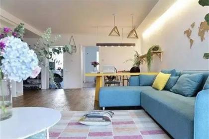 软装方面,老式实木沙发换成湖蓝色的布艺沙发,粉色的地毯和纯色的抱枕相互映衬,简单清新。