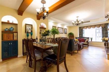 整个客餐厅的家具都非常的大气典雅,有很美式风范。餐厅出留下的壁橱空间,又带有一些地中海风的感觉。